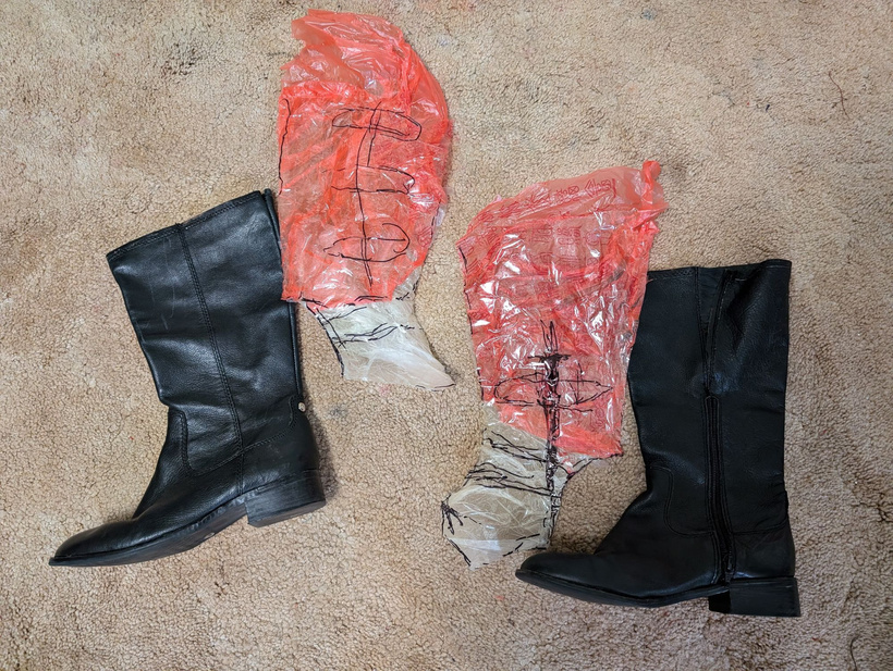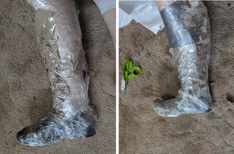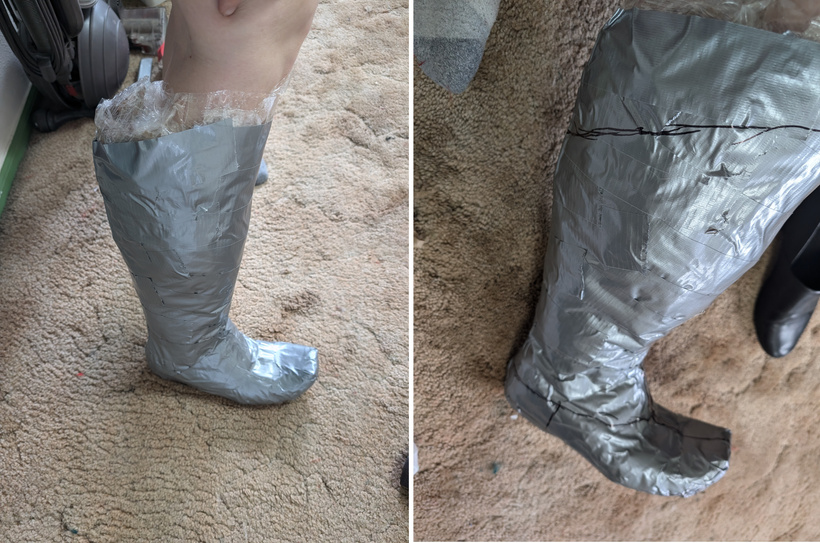 2. Put your boot on. If the boot isn’t the right shape you’re going to pad the boot and your calf until it is. You can use foam, paper, plastic bags and tape to create the right shape. Then you’re going to cover the whole thing in plastic wrap or your plastic bags. You’re going to carefully (without messing up the shape of the boot, tape around the plastic bags until the plastic and tape is form fitting to the boot. (Did I forget to take pictures of this step, yes, but here’s a photo of me doing the process with a different shoe: