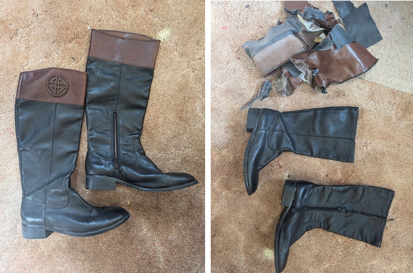 1. First things first get your boots and tailor them as needed. In this case I removed the tops and most of the insides since the insides were falling apart on these. You do whatever you need done to get the basic shape you want.